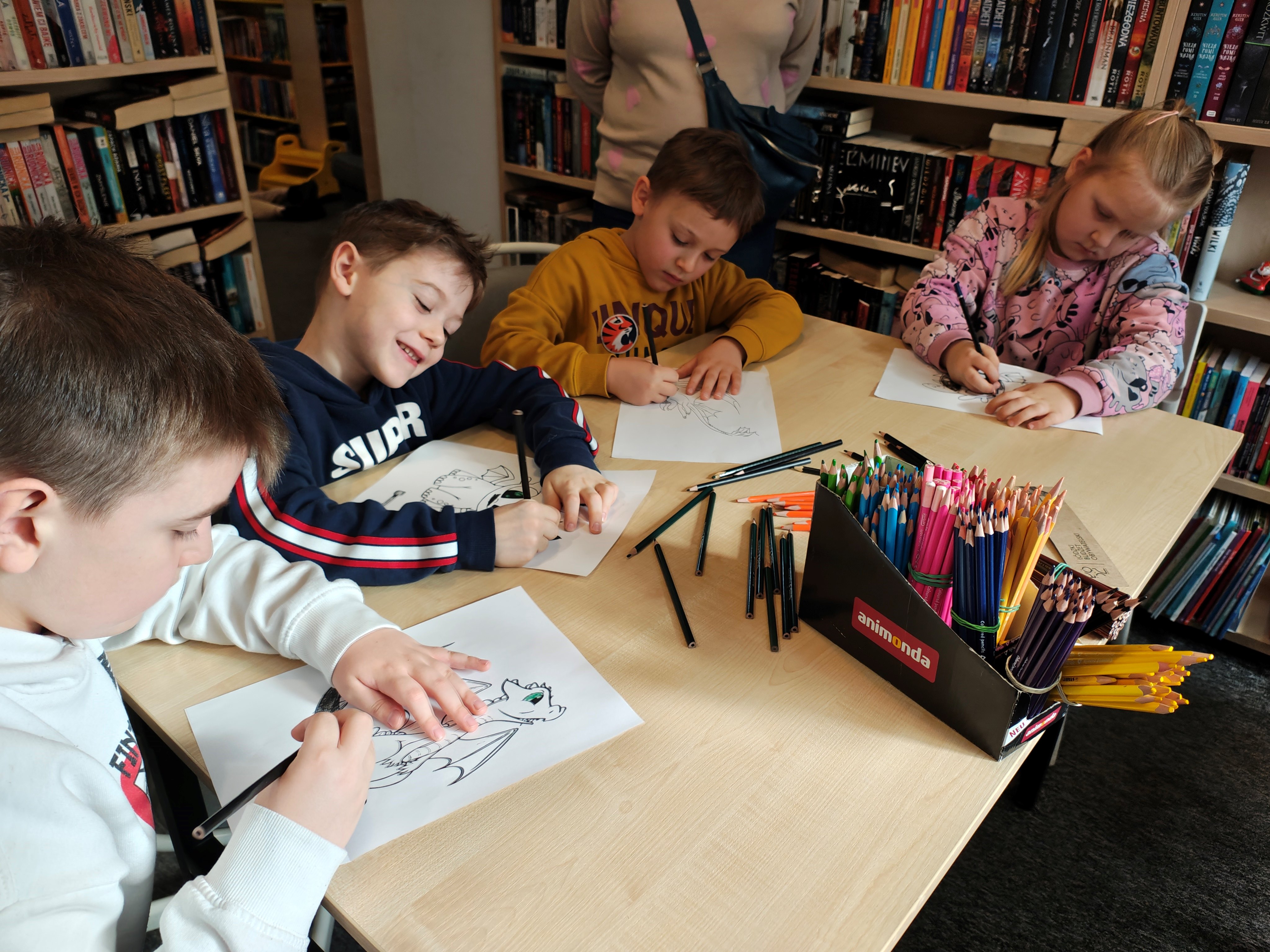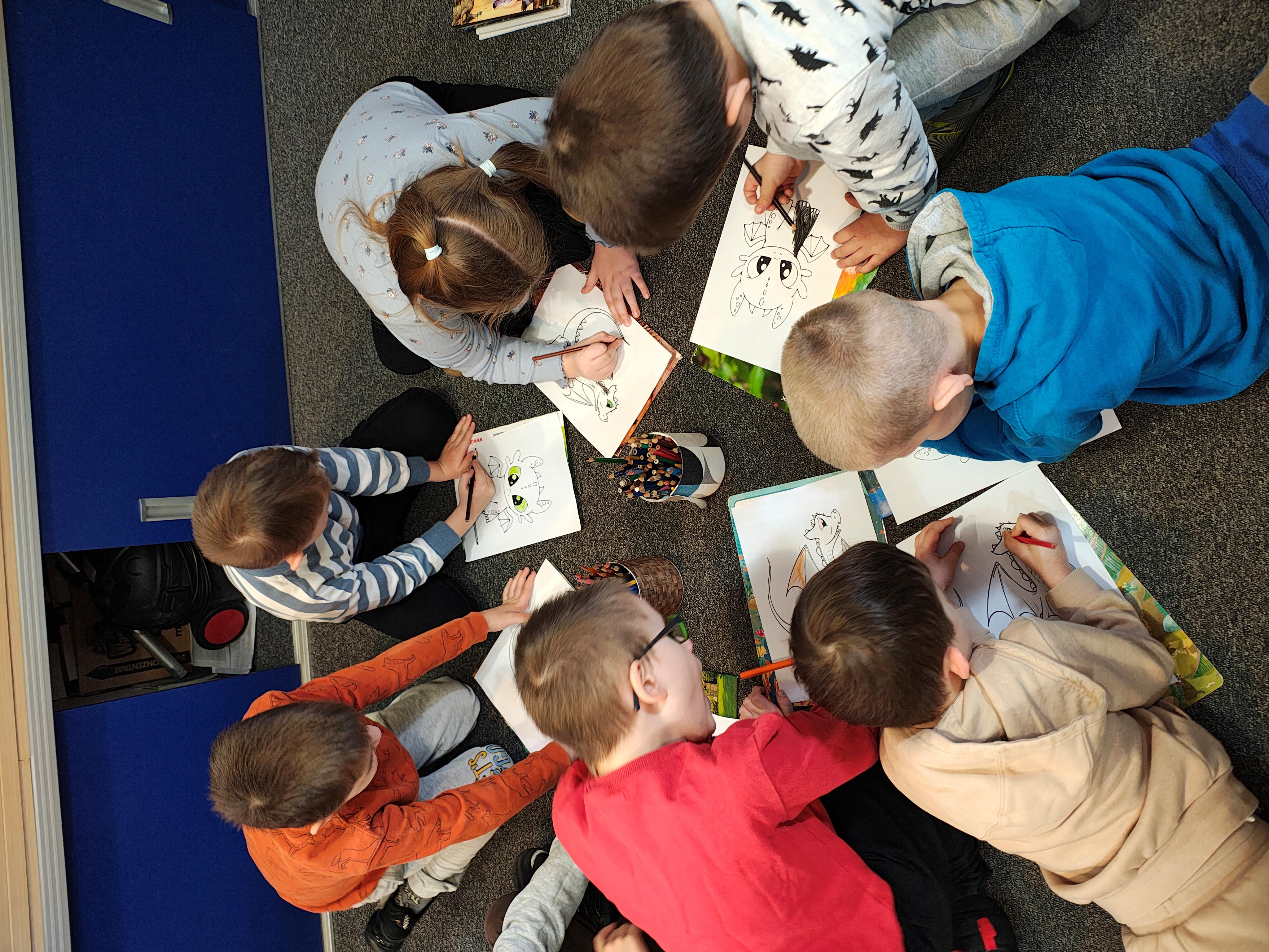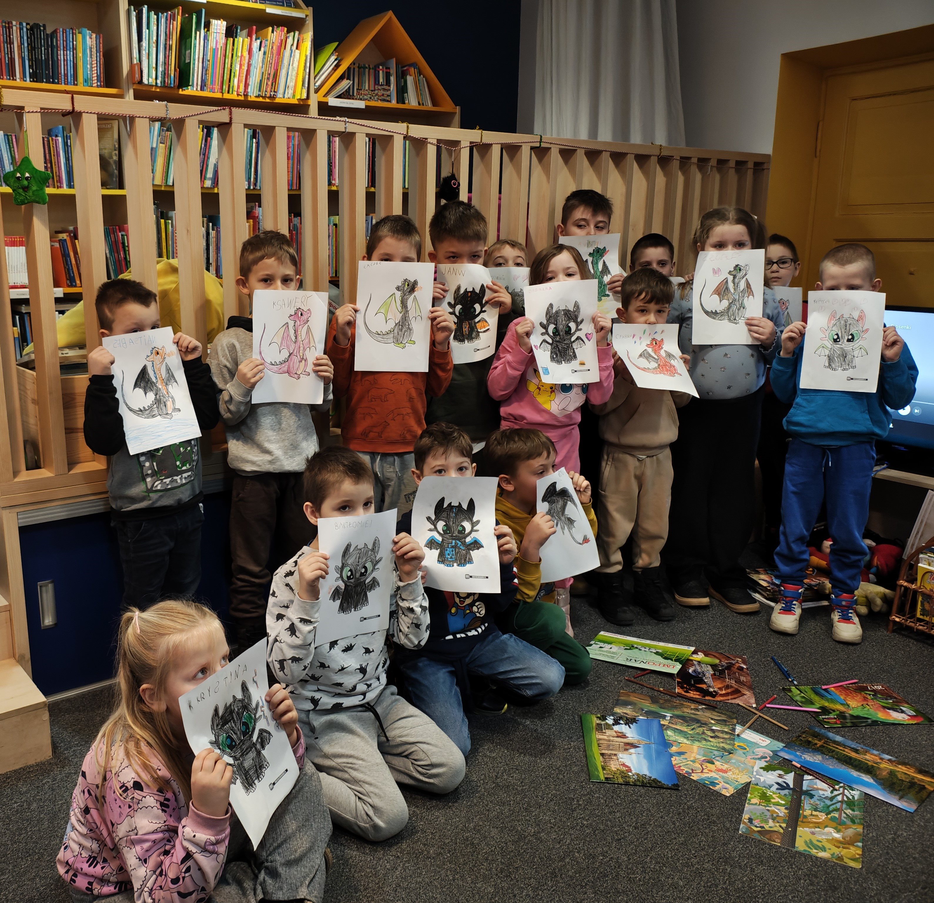 We wtorek 24.02 grupa II odwiedzia Bibliotekę Miejską "Przystań". Przedszkolaki wzięły udział w zajęciach edukacyjnych o smokach. Wysłuchały "Legendy o Smoku Wawelskim", dowiedziały się, że smoki są "spokrewnione" z dinozaurami, słuchały piosenek o smokach oraz kolorowały obrazki ze smokami.