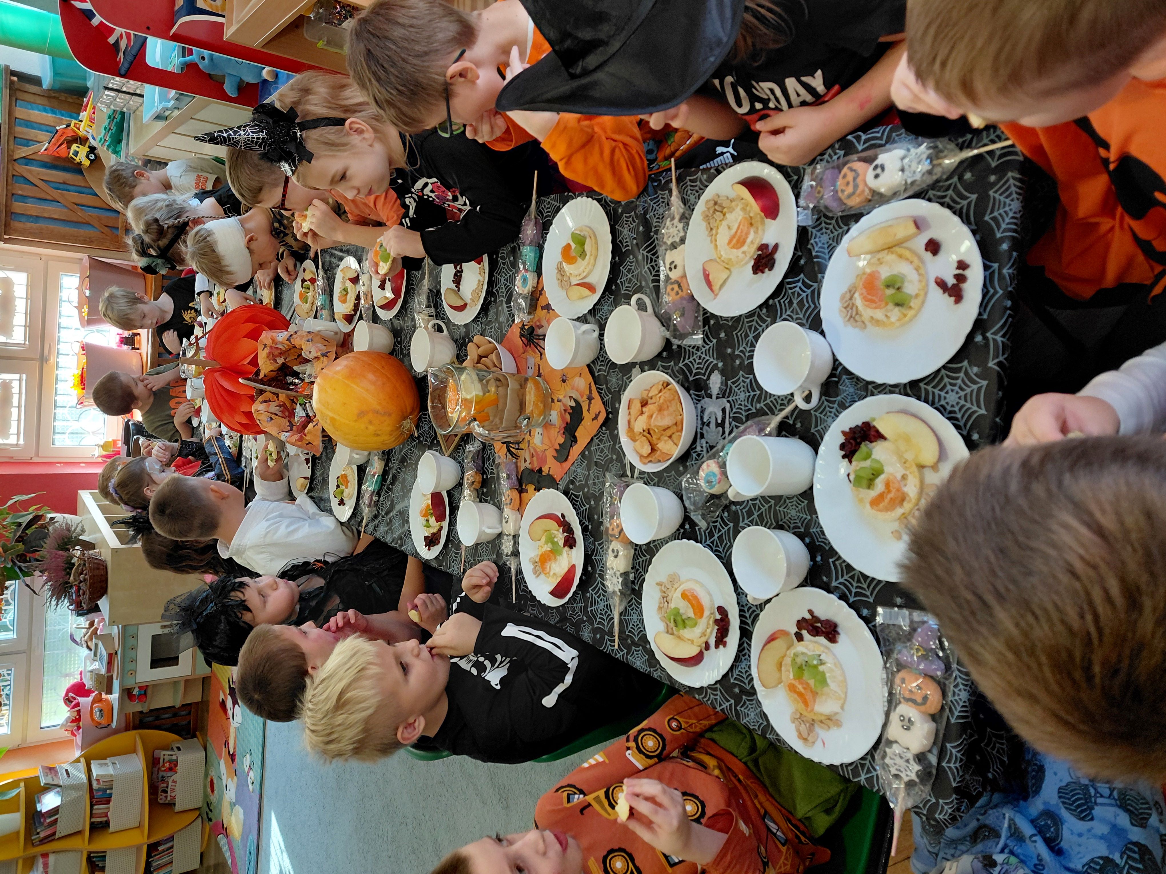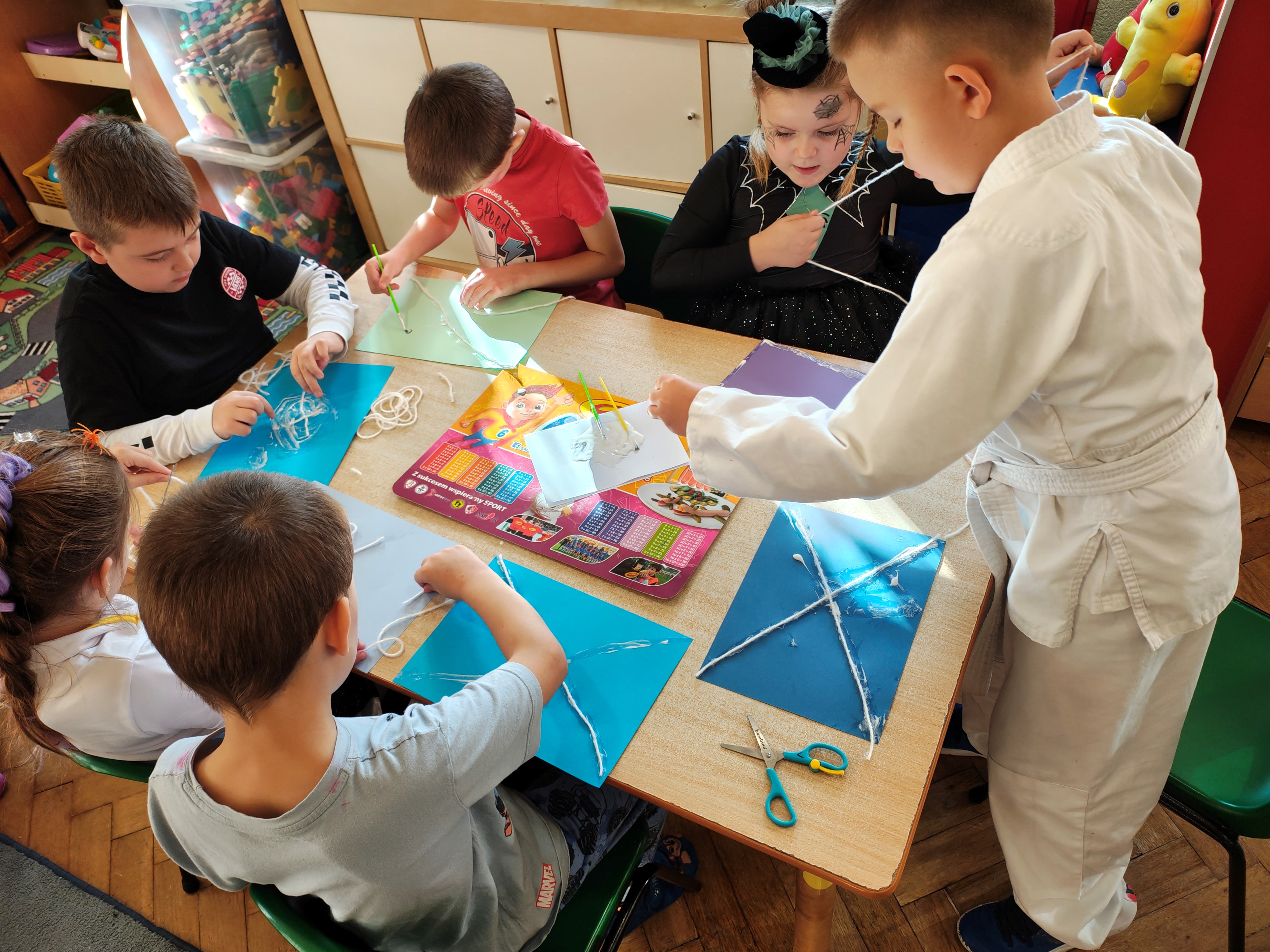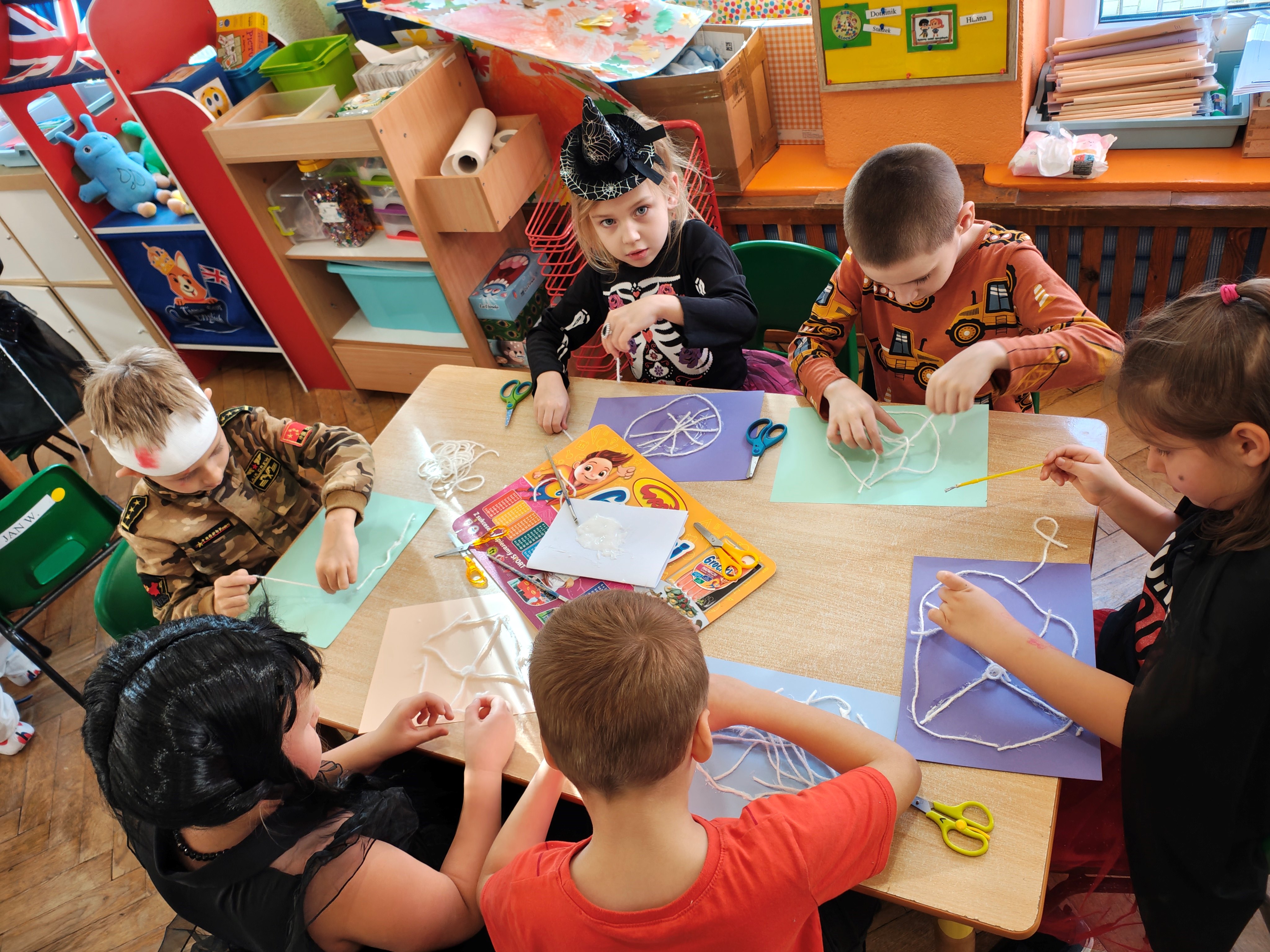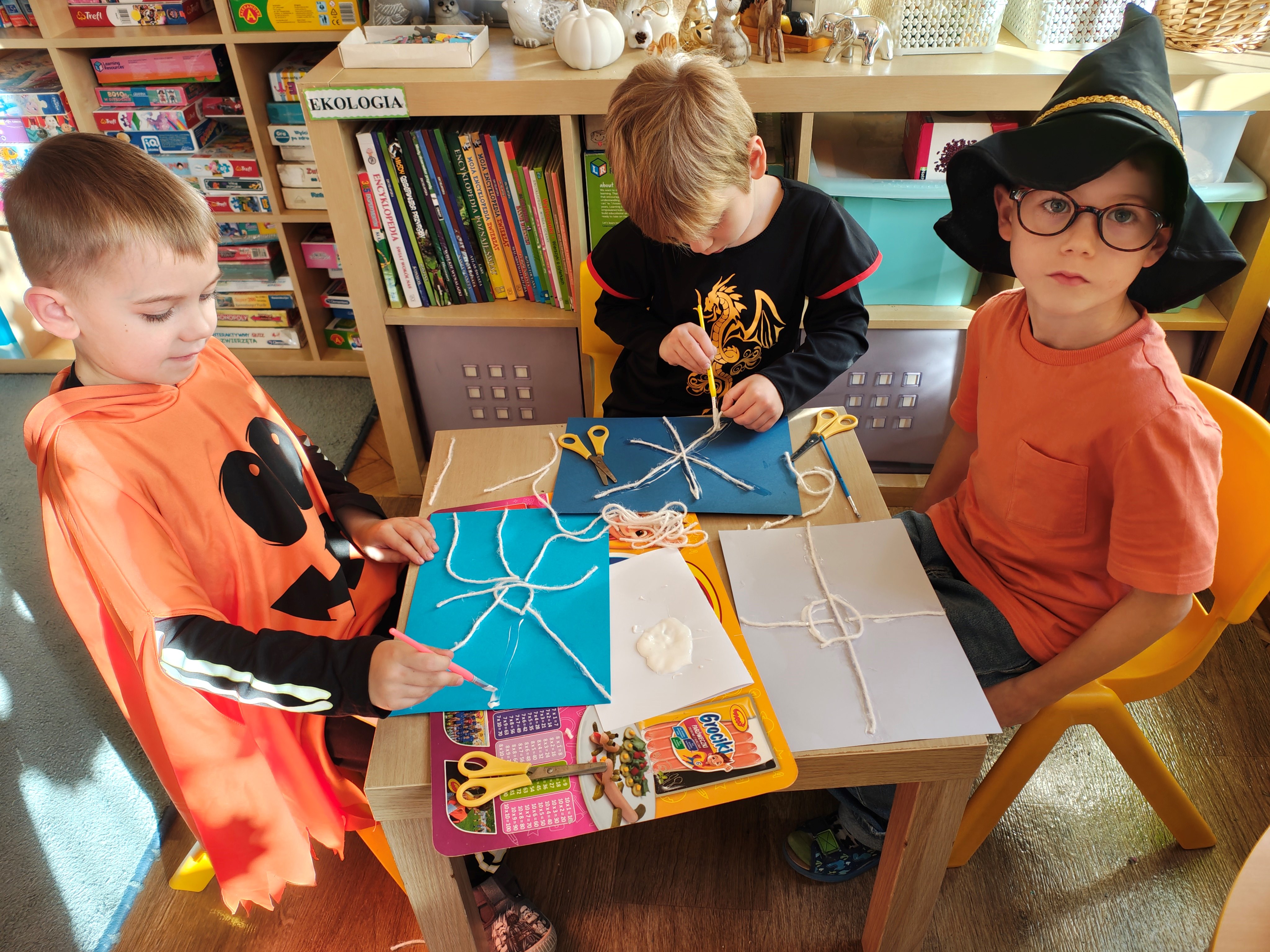 W piątek 31.10.2025 roku w przedszkolu odbyło się Halloween. Dzieci z grupy II brały udział w halloweenowych zabawach, jadły drugie śniadanie przy stole udekorowanym obrusami w pajęczyny i halloweenowymi dekoracjami oraz wykonały pracę plastyczną - pajęczyny z wełny oraz pająki z plasteliny.