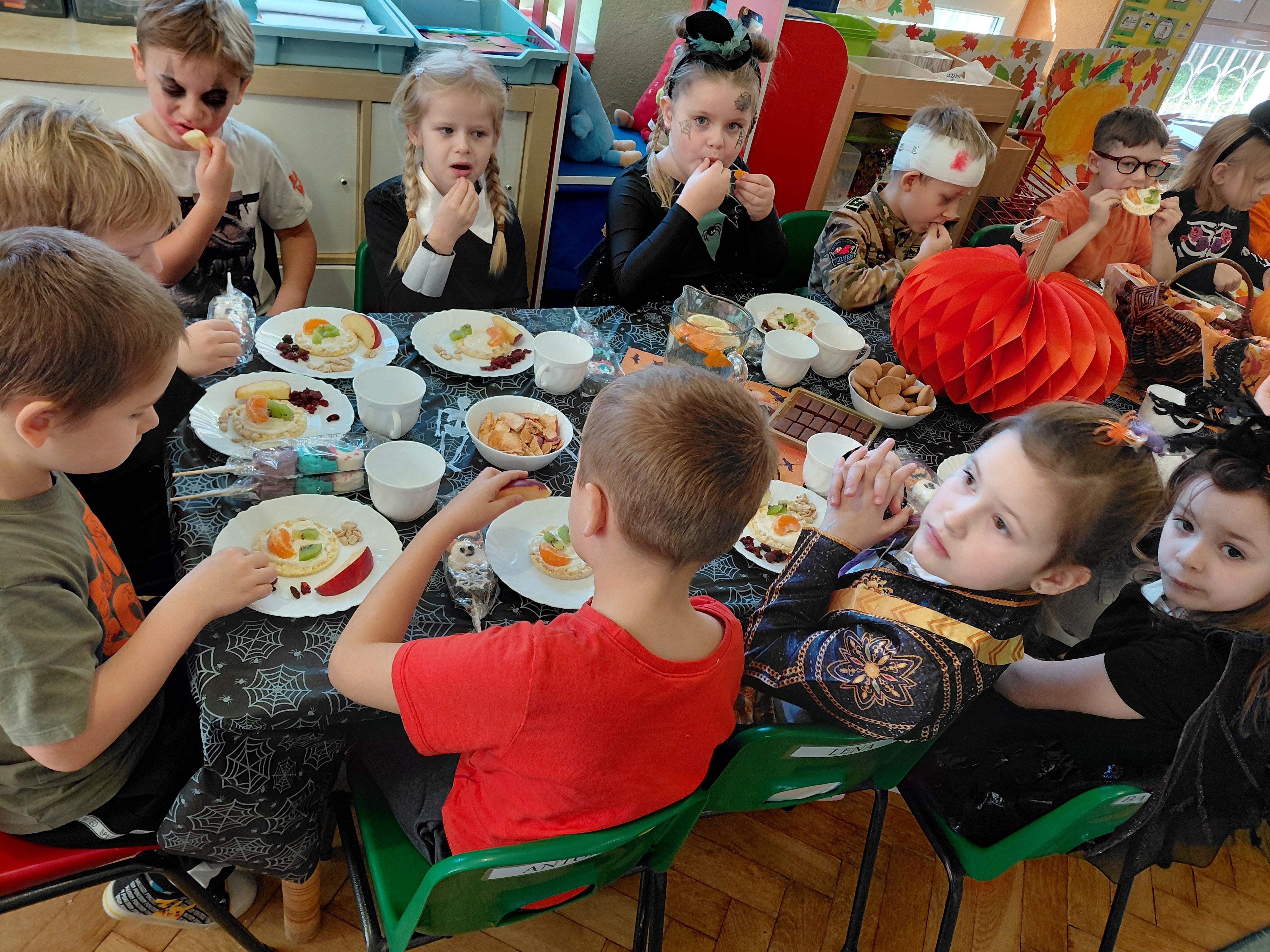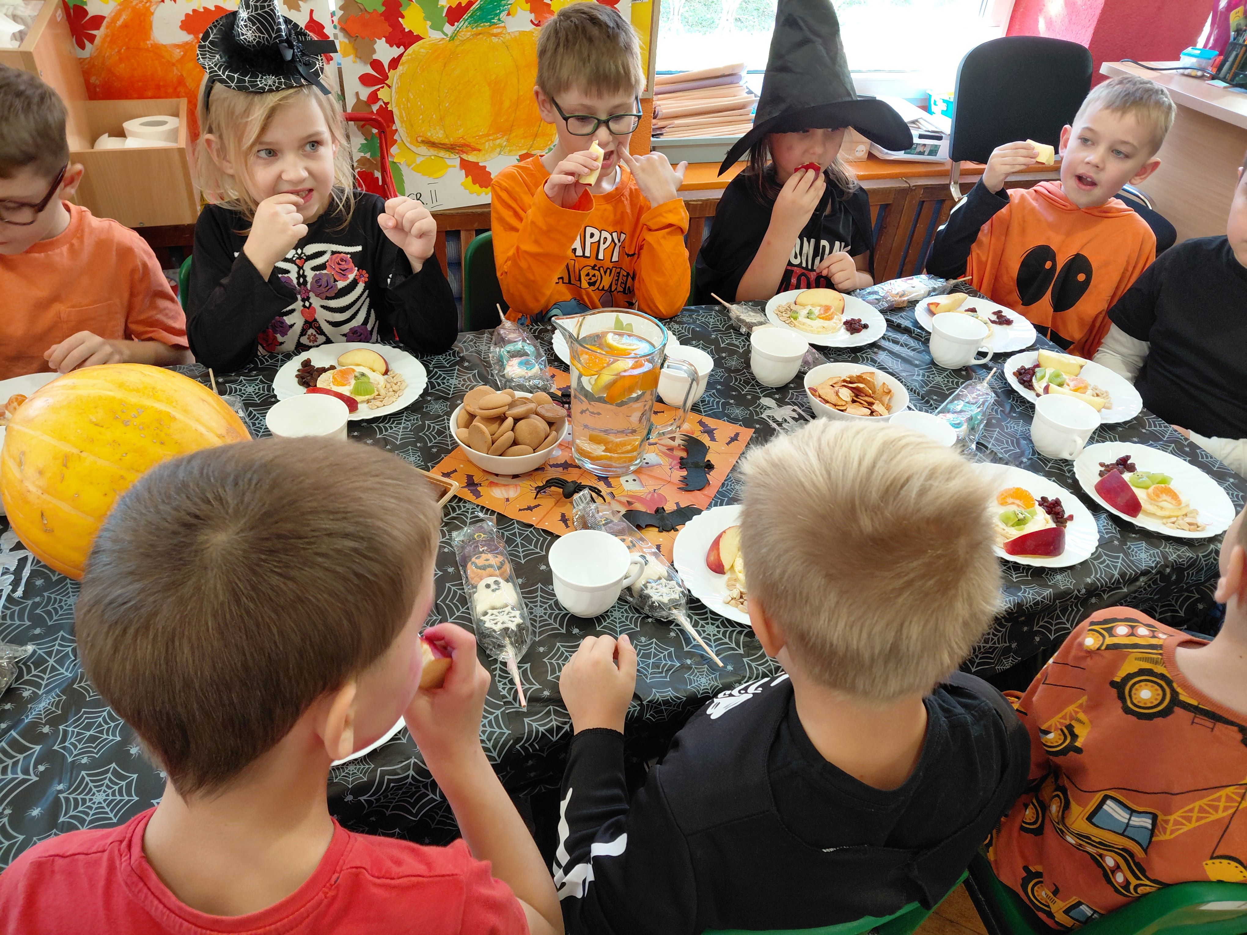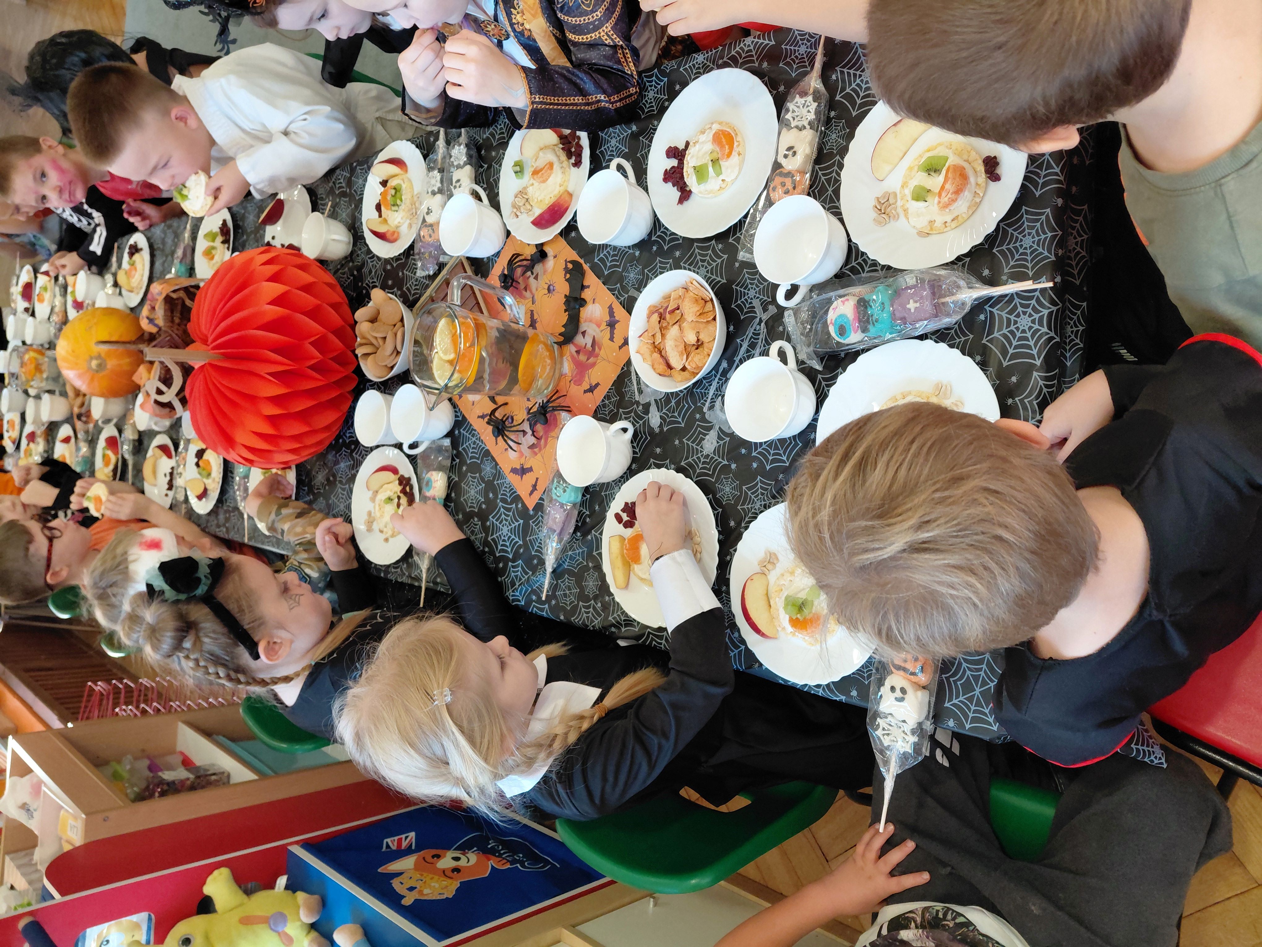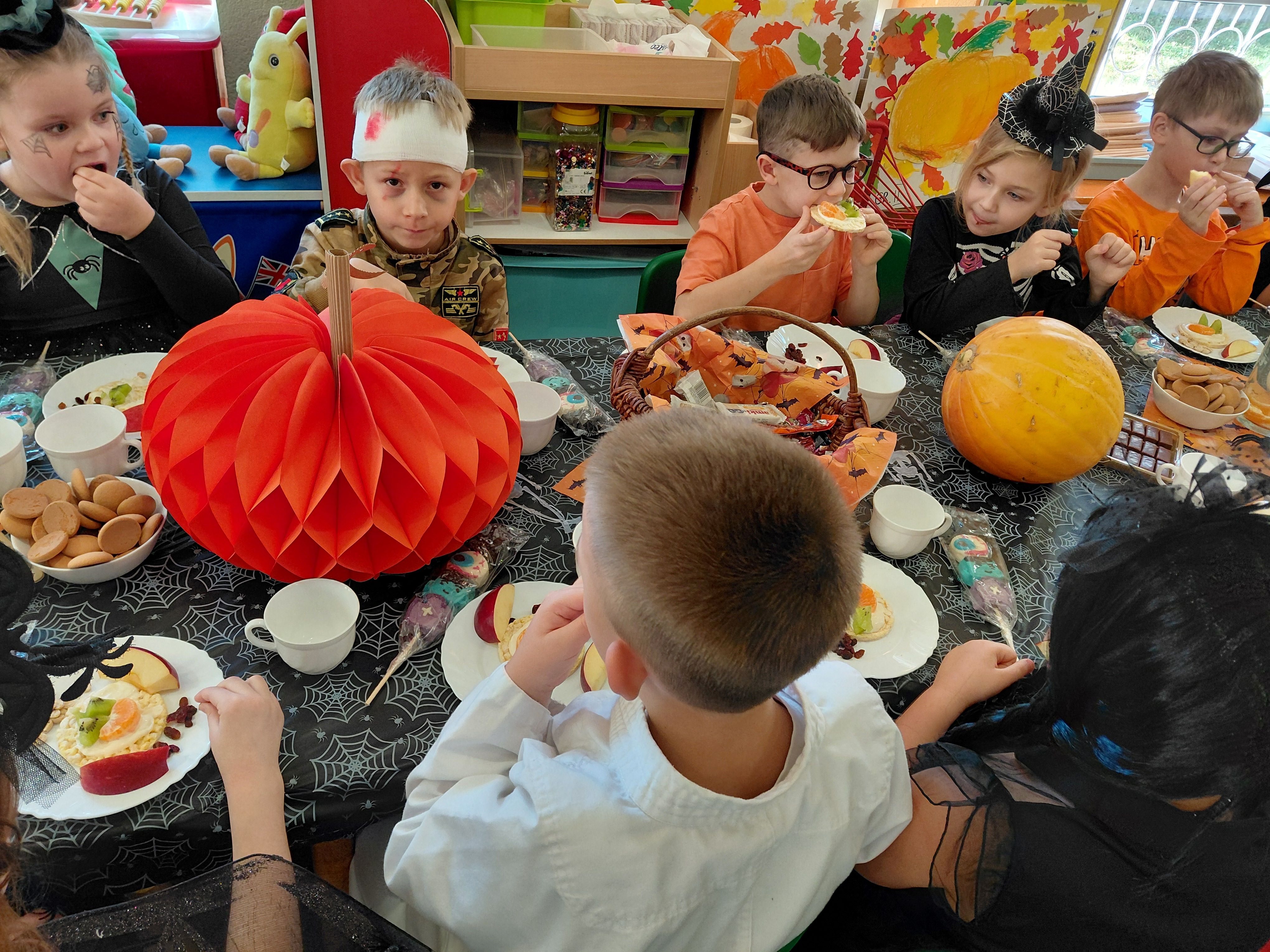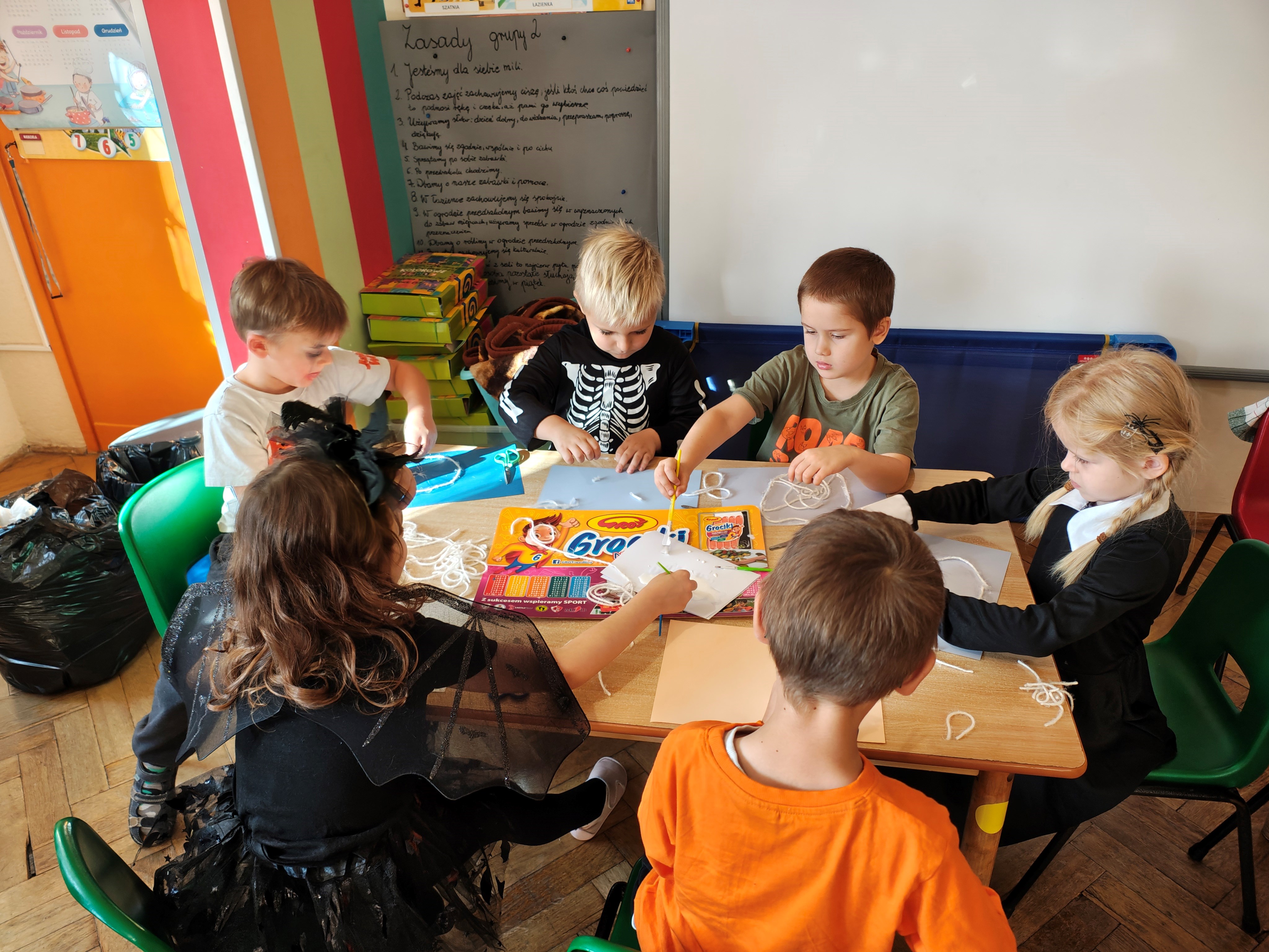 W piątek 31.10.2025 roku w przedszkolu odbyło się Halloween. Dzieci z grupy II brały udział w halloweenowych zabawach, jadły drugie śniadanie przy stole udekorowanym obrusami w pajęczyny i halloweenowymi dekoracjami oraz wykonały pracę plastyczną - pajęczyny z wełny oraz pająki z plasteliny.