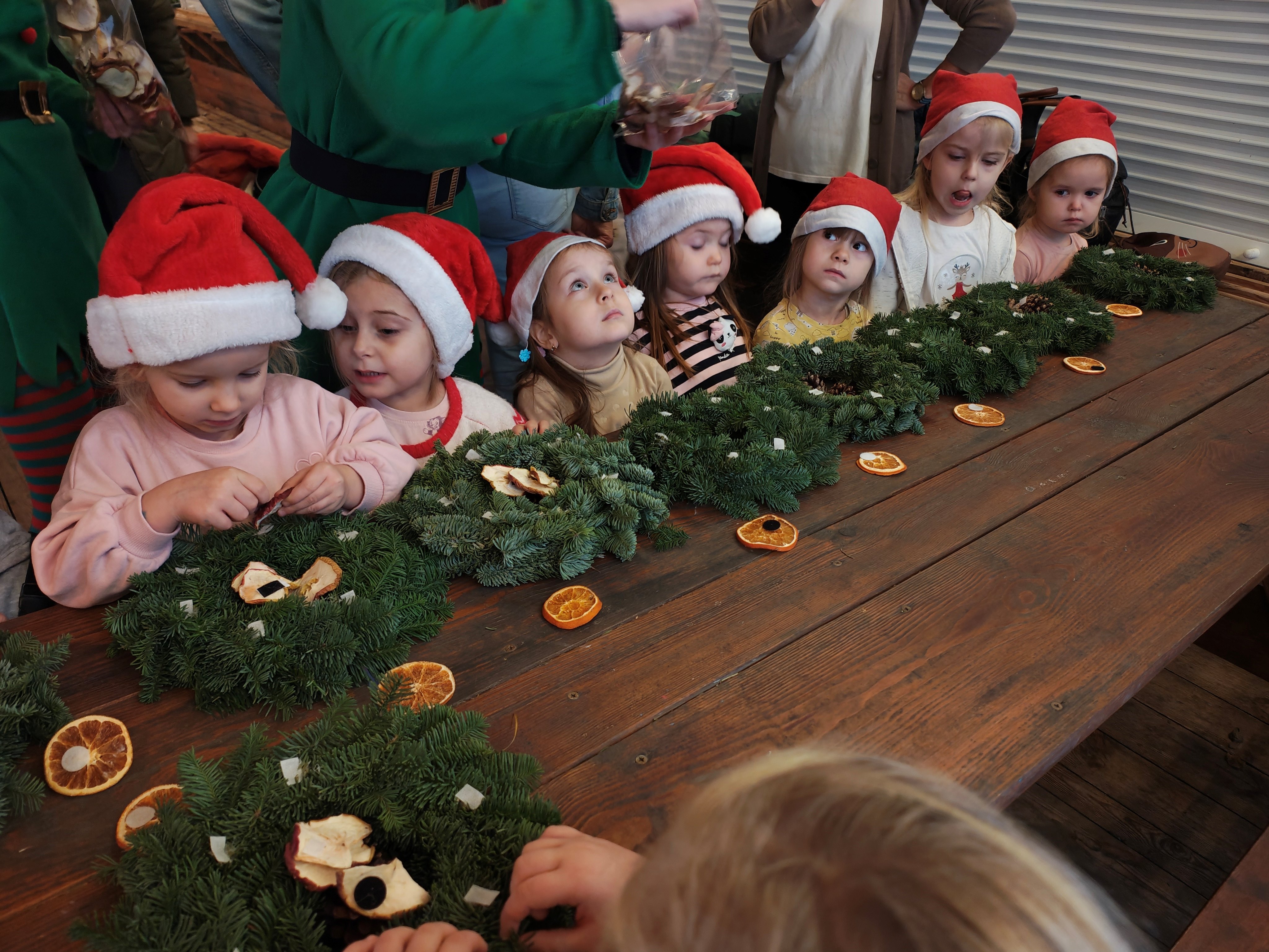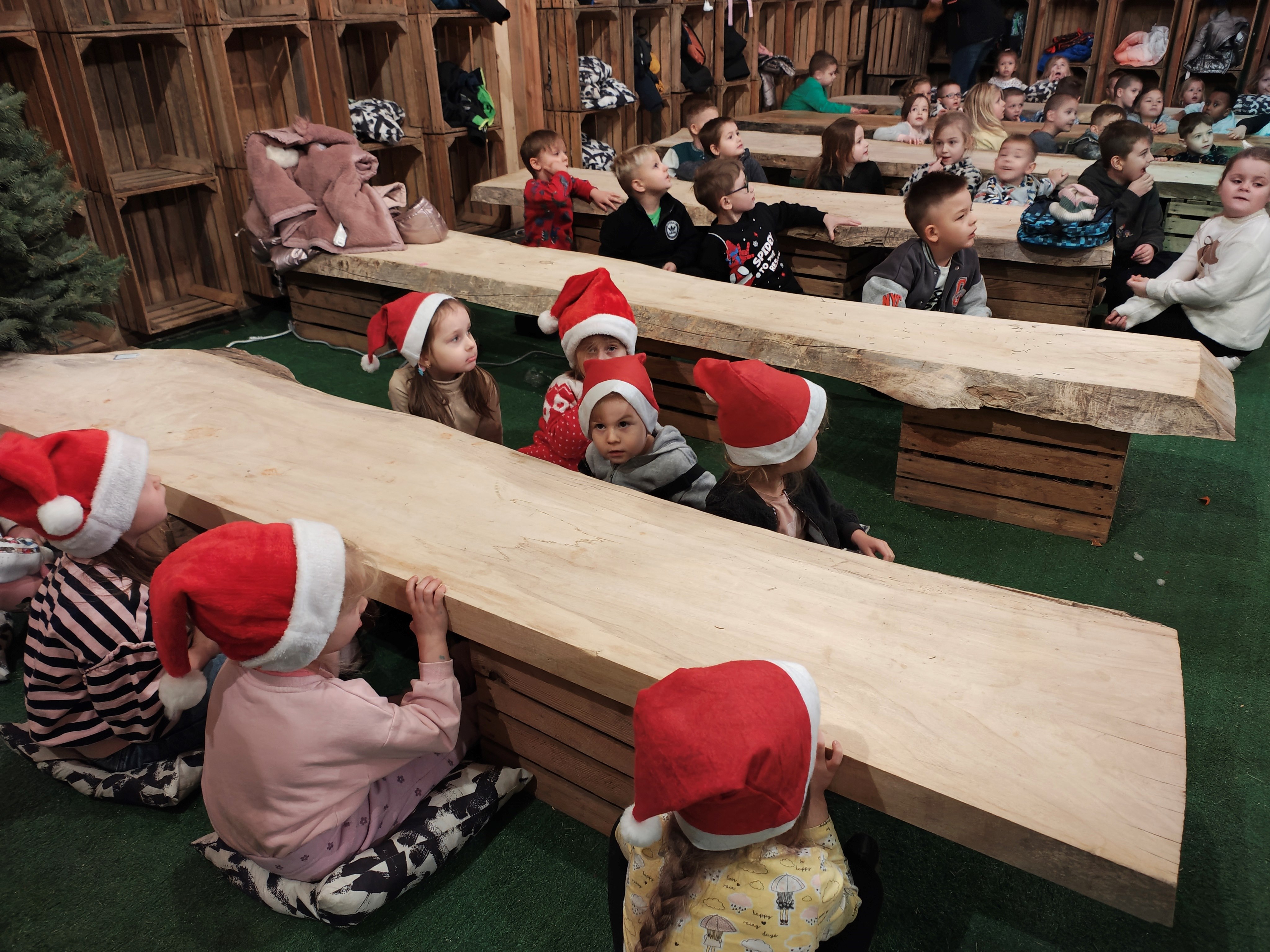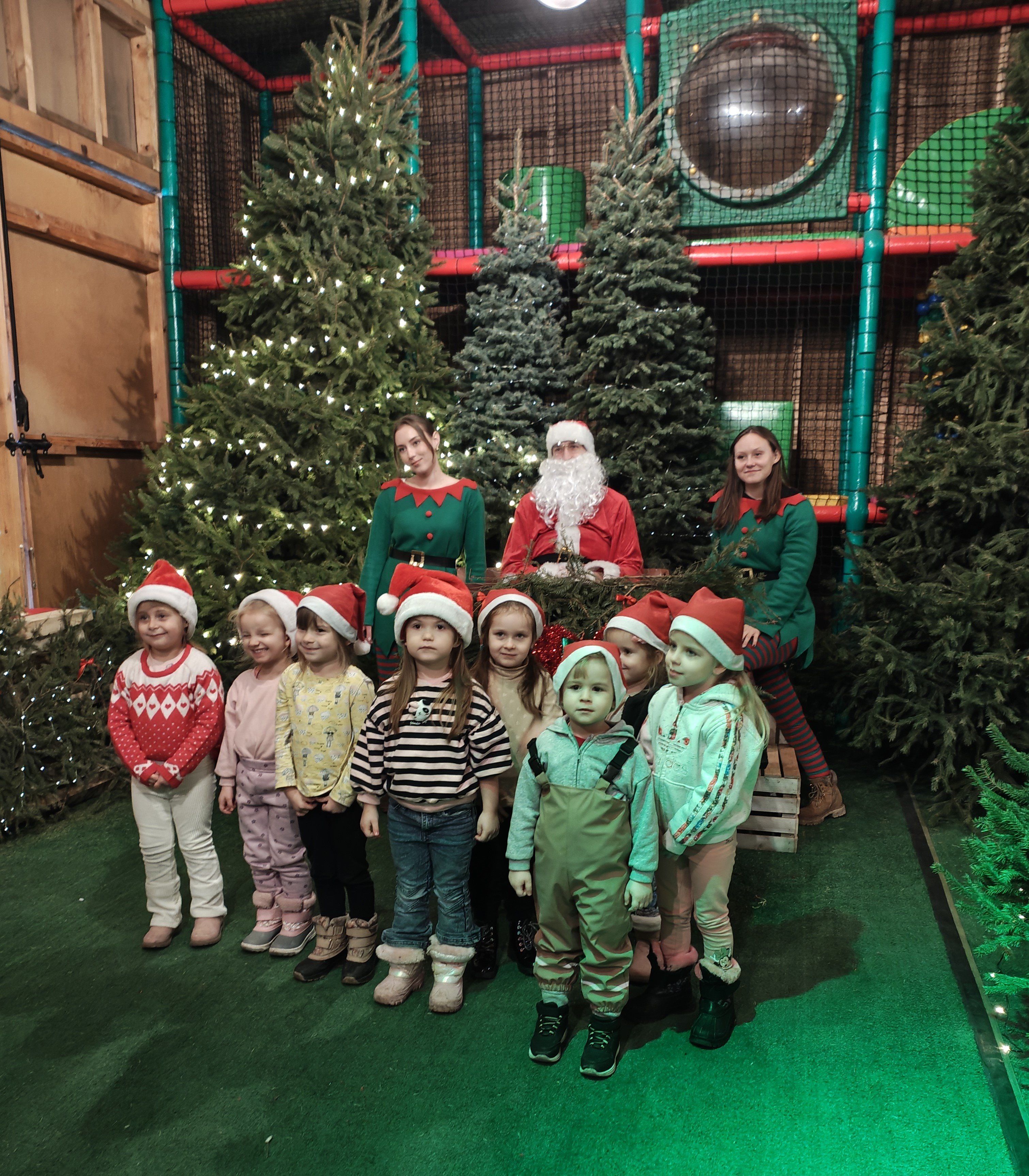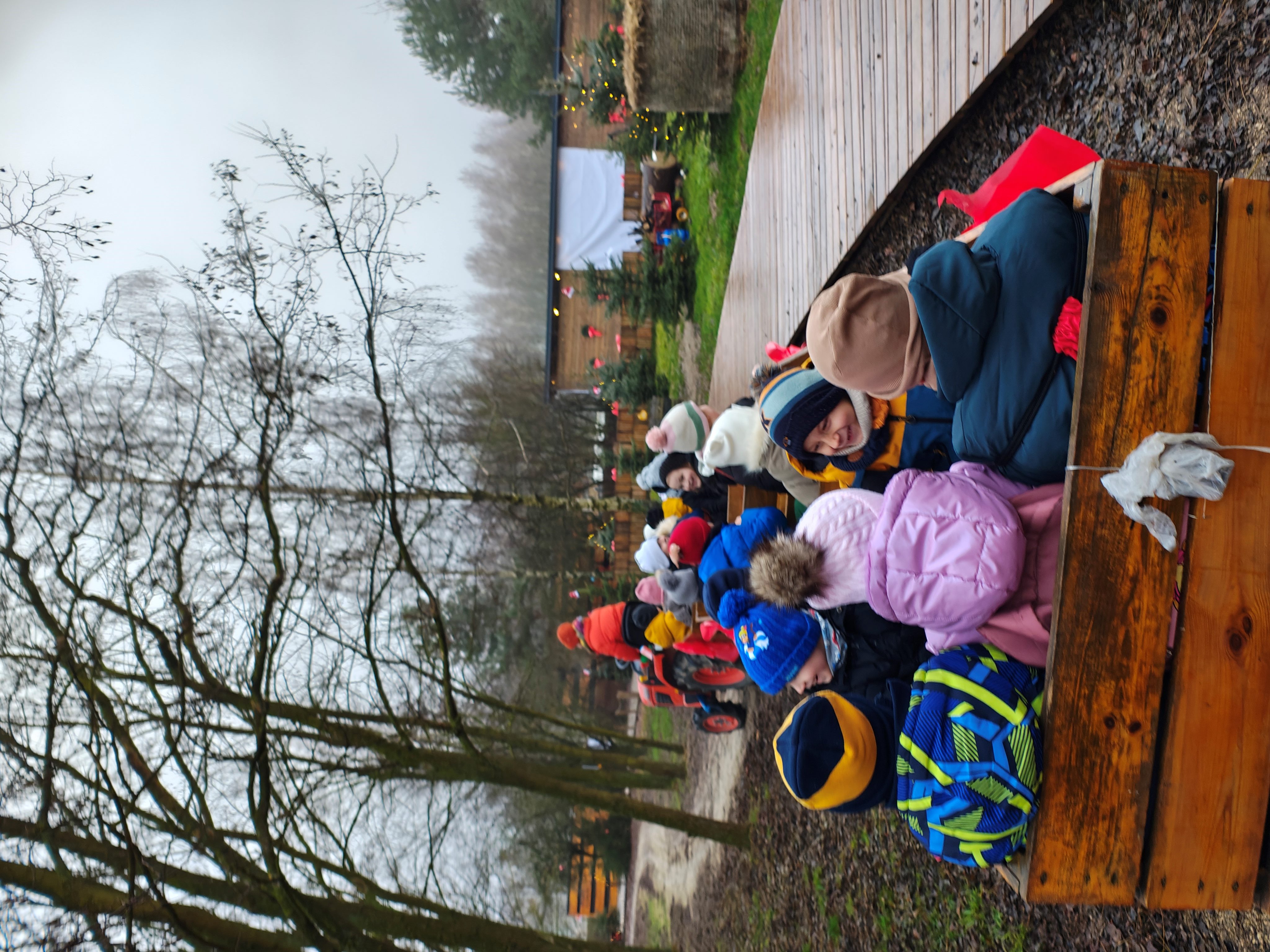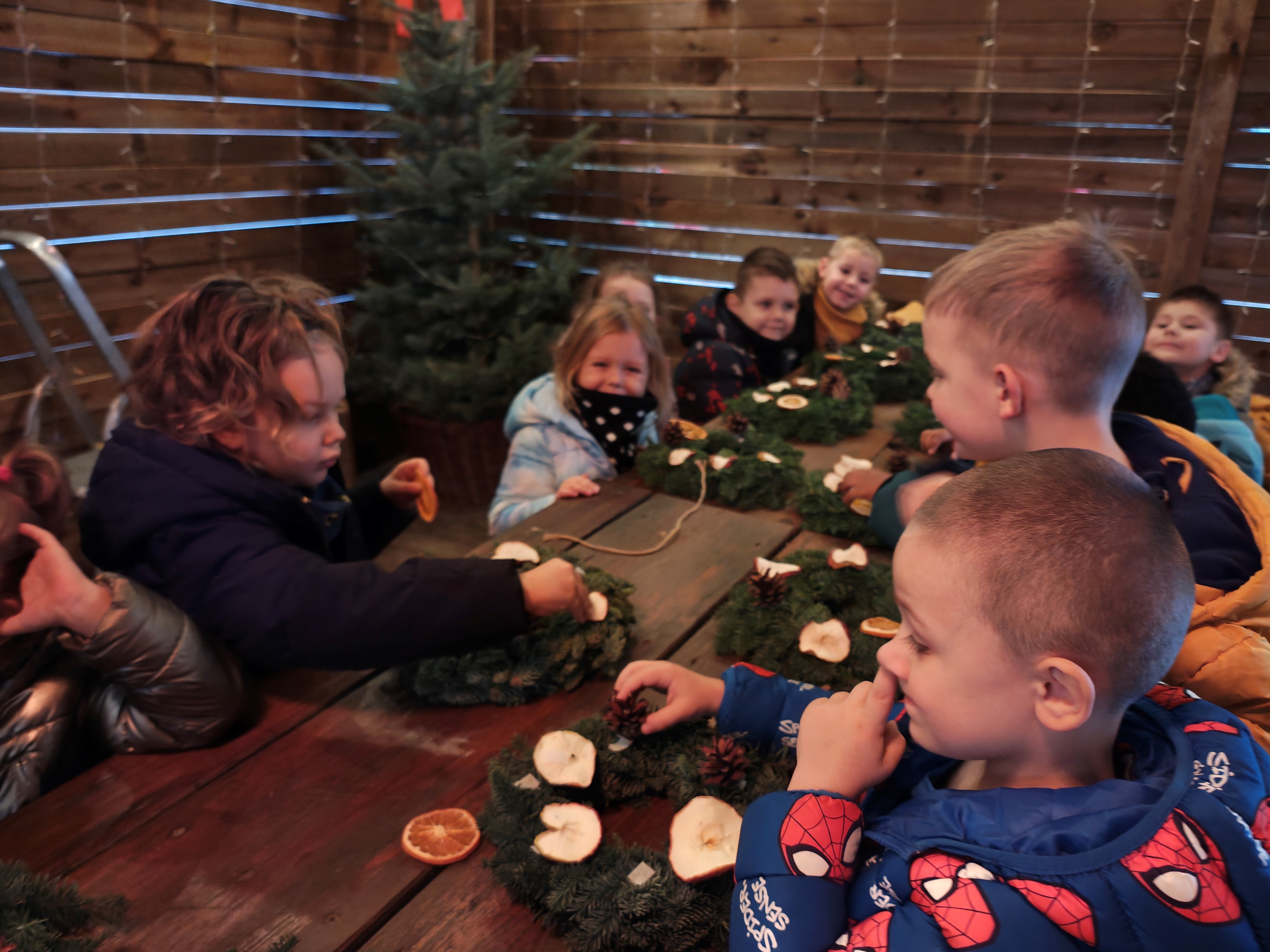 W czwartek 18.12. pojechaliśmy na wycieczkę autokarową do Sadów Klemensa. Przedszkolaki wzięły udział w warsztatach i wykonały wieńce bożonarodzeniowe. Spotkały również Mikołaja, z którym każdy miał okazję zamienić słówko oraz wspólnie z elfami i Mikołajem pobawić się przy muzyce. Wycieczkę zakończyliśmy pieczeniem kiełbasek oraz przejażdżką w wagonikach, które ciągnął mały traktor.