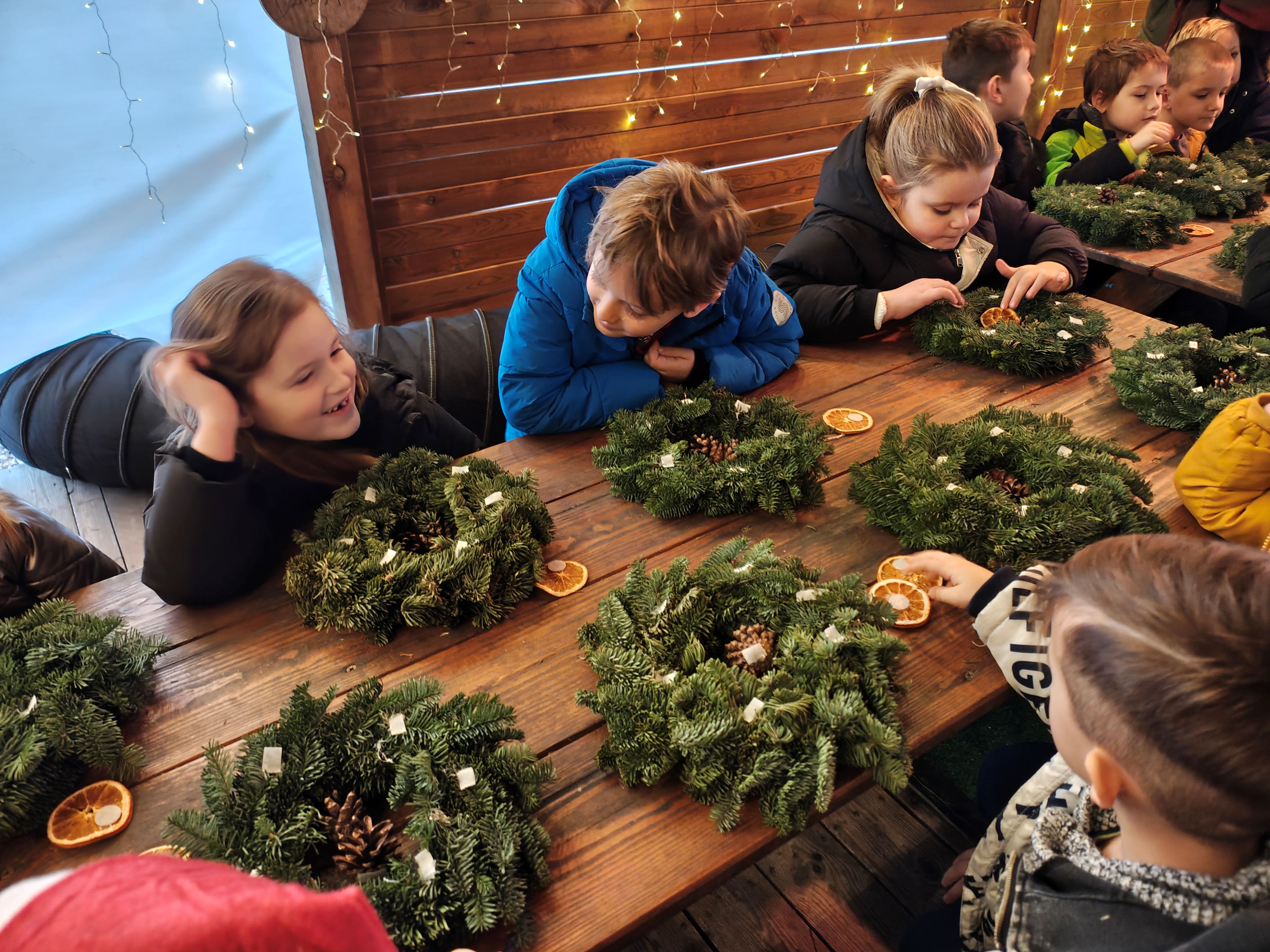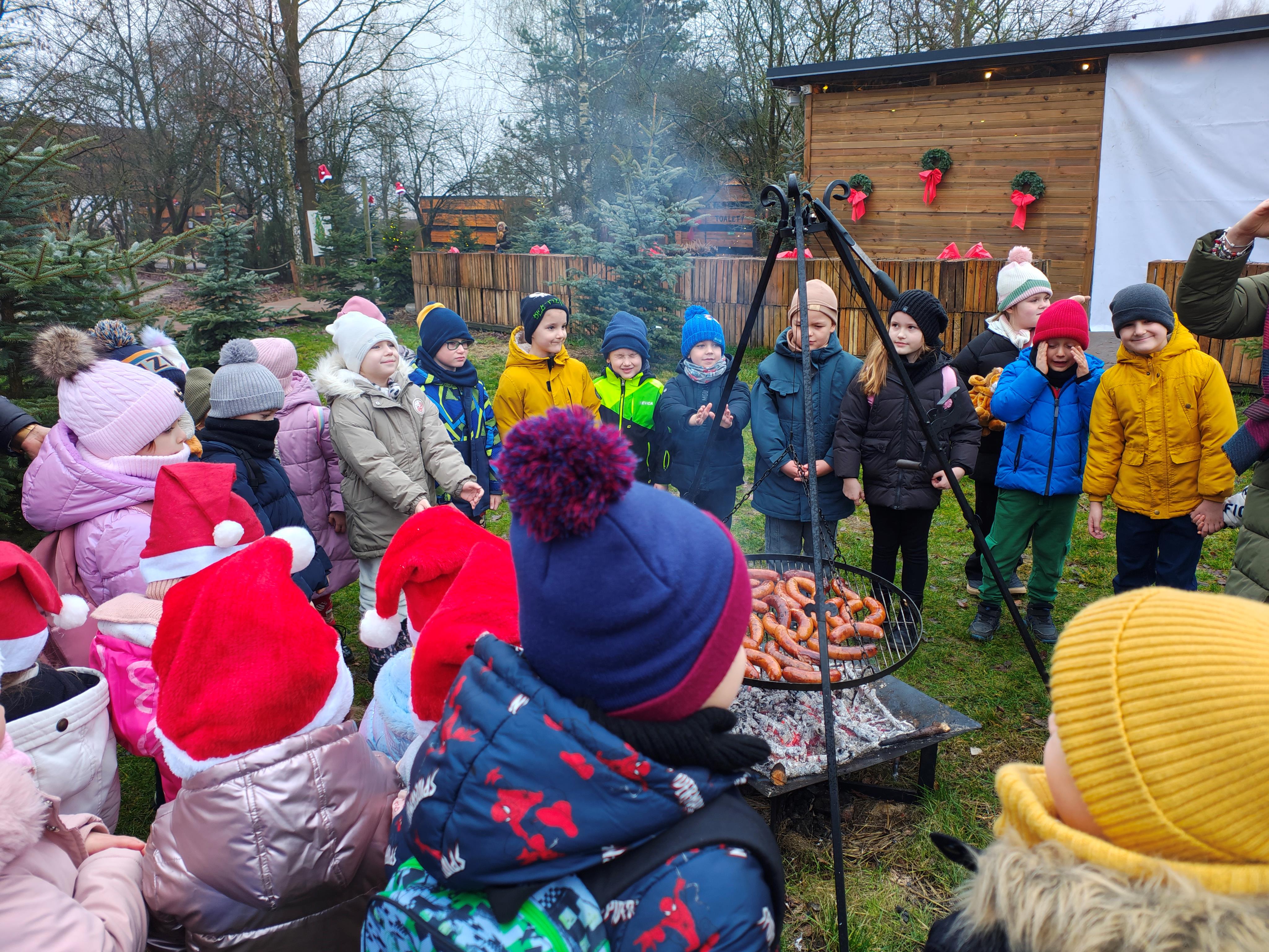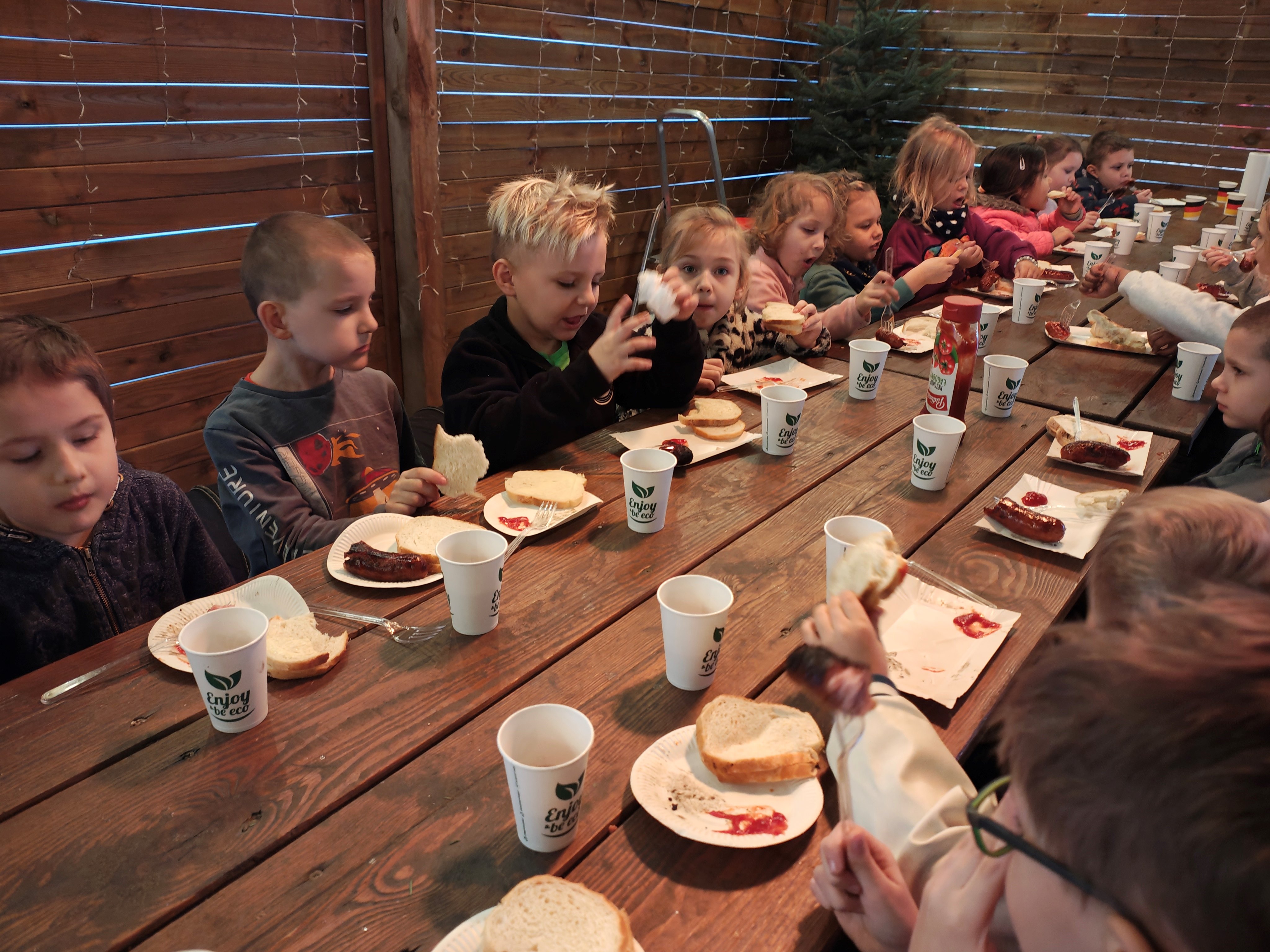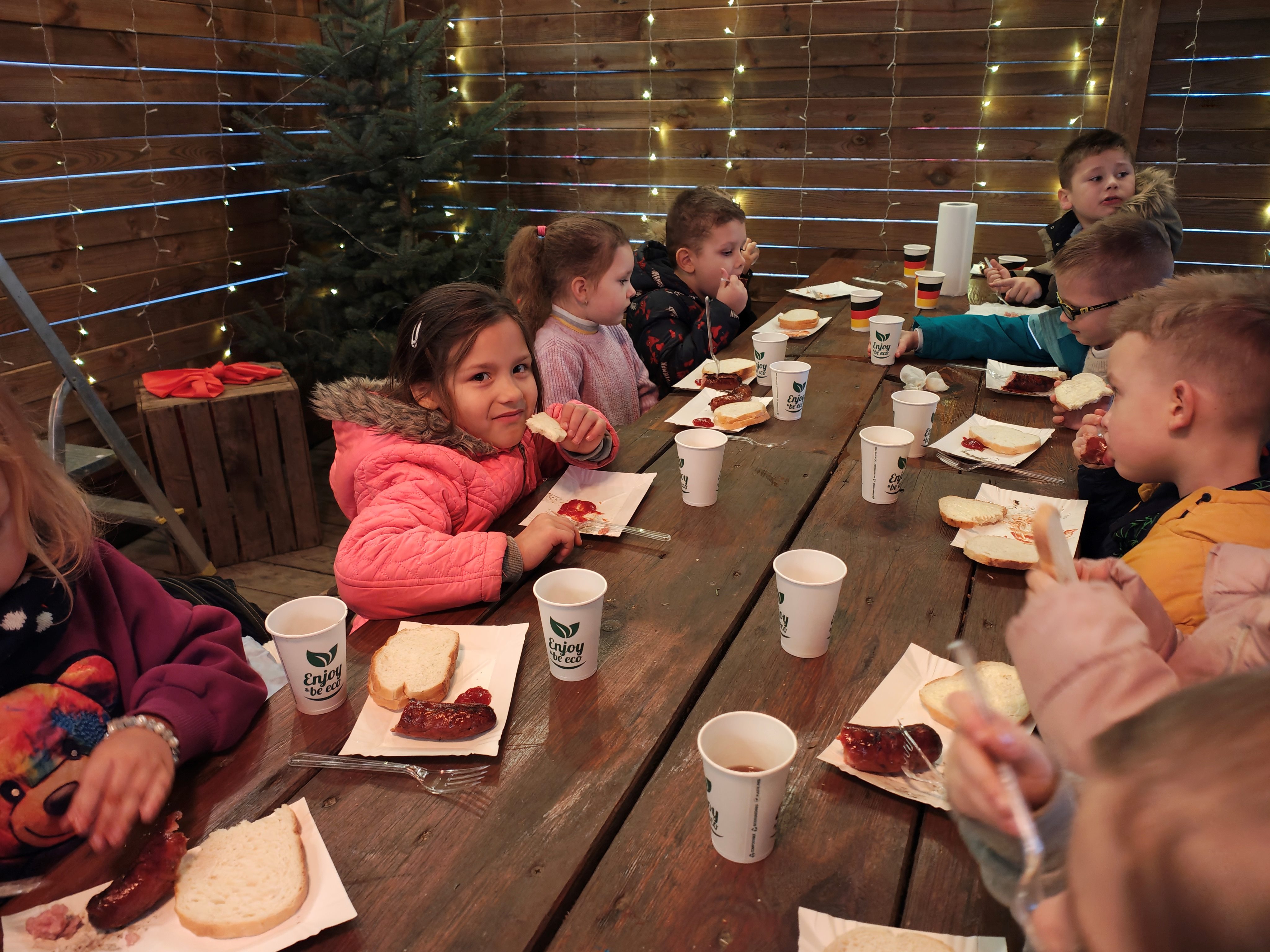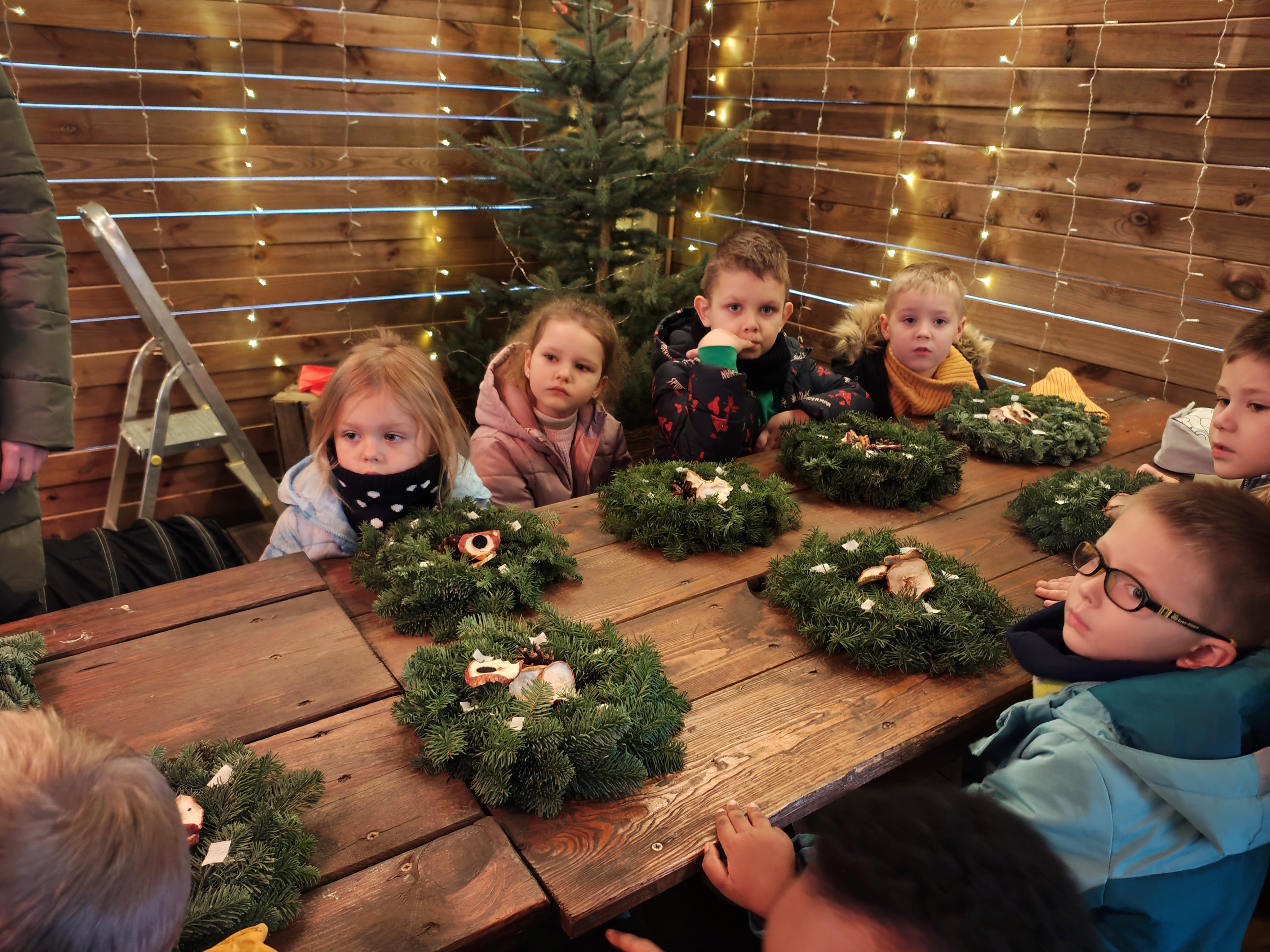 W czwartek 18.12. pojechaliśmy na wycieczkę autokarową do Sadów Klemensa. Przedszkolaki wzięły udział w warsztatach i wykonały wieńce bożonarodzeniowe. Spotkały również Mikołaja, z którym każdy miał okazję zamienić słówko oraz wspólnie z elfami i Mikołajem pobawić się przy muzyce. Wycieczkę zakończyliśmy pieczeniem kiełbasek oraz przejażdżką w wagonikach, które ciągnął mały traktor.